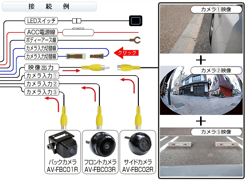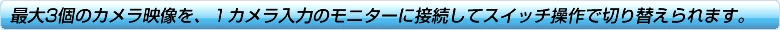最大3個のカメラ映像を、1カメラ入力のモニターに接続して