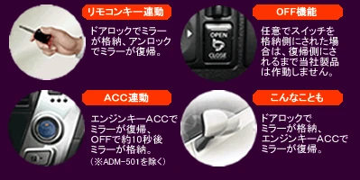 ADM-501を除く車種別適合タイプはリモコンキー連動タイプ(ADL-11)機能とACC連動タイプ(ADK-98)の機能を搭載しておりますので、お好みに応じた選択が可能ですが、両タイプの機能を併用する事は出来ません。