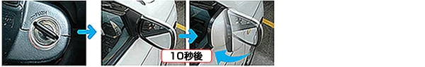 エンジンキーをACCにするとドアミラーが復帰、キーOFFから約10秒後にドアミラーを格納します。