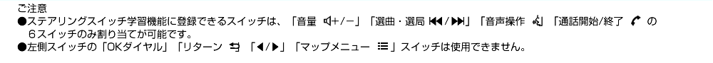 | <注意>ご使用になる市販ナビゲーションの機種によってはステアリングスイッチの抵抗値が学習機能範囲外となり学習(登録)出来ない場合があります。 |