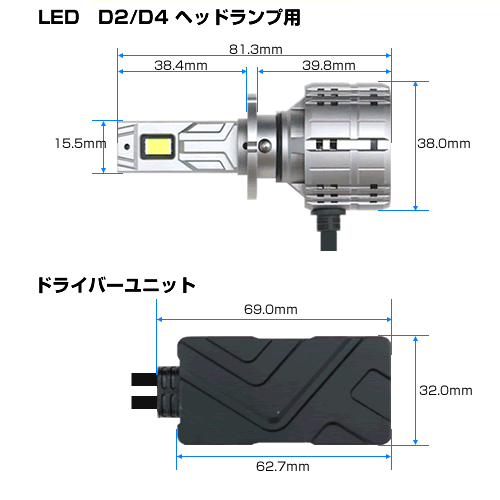 | 本製品は『D2S/D2R』『D4S/D4Rタイプ』のキセノン・HIDヘッドランプをLED化する製品です。