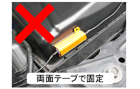 それはダメですよ! メタルクラッド抵抗はかなり熱くなりますから、樹脂製の部品やハーネスの被覆に触れていると樹脂部分が溶けたり変形します。 両面テープも熱ではがれてしまうので、必ず金属製のネジやボルトを使って車両の金属部分に固定してください。 結束バンド等で配線と一緒に固定したり抵抗器の上から断熱材を巻いて固定している方を見かけますが、 この方法はハーネスの被覆が溶けてショートしたり、抵抗器の放熱が出来なかったりで車両火災の原因となりますので 絶対にこの様な取り付け方法はやめてください。 |