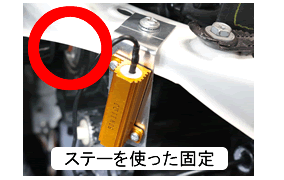 車両の金属部分だと抵抗器の放熱も兼ねる事が出来るので一番安全です。 穴位置の関係やスペース的な問題で取り付けが困難な場合は、金属ステーを使って別の場所に設置する方法もあります。 ステーを使えば作業しやすい場所へ設置できますし、ステーへ針金を巻きつけて固定する方法も可能になりますからね。 |