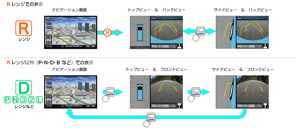 | ●アラウンドビューモニター映像(フロント・サイド・リヤ)を市販ナビゲーションに表示出来ます。 | |||||||||||||||||||||||||||||