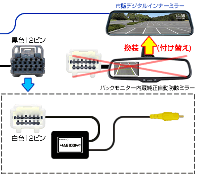 | 純正自動防眩インナーミラー[バックモニター内蔵]から市販デジタルインナーミラーへの換装車両(付け替え) |