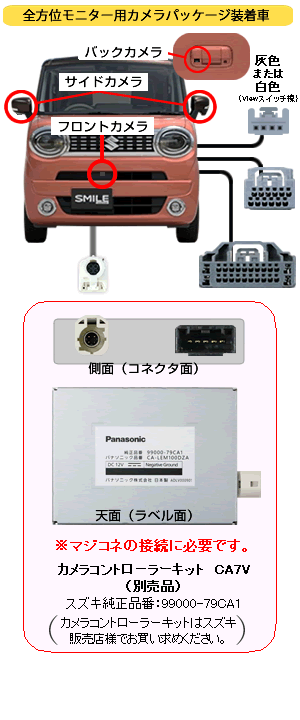 | ・本製品単体では使用出来ません。 スズキ純正【全方位モニターカメラパッケージ装着車用 カメラコントローラーキット(CA7V:純正品番/99000-79CA1)】をスズキ販売店様でお買い求めください。 ・本製品接続時は「オーディオハーネス」など、12ピン/24ピンコネクターに接続する他製品との併用は出来ません。 ・本製品作動時における 「自車位置表示不正確」 及び 「車速信号エラー」 について (PDF) |