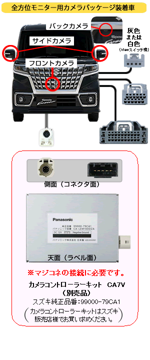 | ◆本製品単体では使用出来ません。 スズキ純正【全方位モニターカメラパッケージ装着車用 カメラコントローラーキット(CA7V:純正品番/99000-79CA1)】をスズキ販売店様でお買い求めください。 ◆「フロント映像自動表示」が 『 ON 』 になっている場合、【R】 レンジからのシフトポジション操作後は「ナビゲーション画面」には戻らず「前方映像」が表示されます。 シフトポジション操作後に「前方映像」を表示させたくない場合は「フロント映像自動表示」を 『 OFF 』 にしてください。 ◆左右確認サポート作動中の通知音はなりません(マーカー表示のみ) ・本製品接続時は「オーディオハーネス」など、12ピン/24ピンコネクターに接続する他製品との併用は出来ません。 ・本製品作動時における 「自車位置表示不正確」 及び 「車速信号エラー」 について (PDF) |