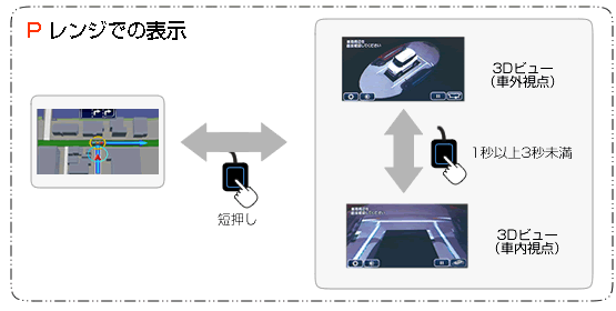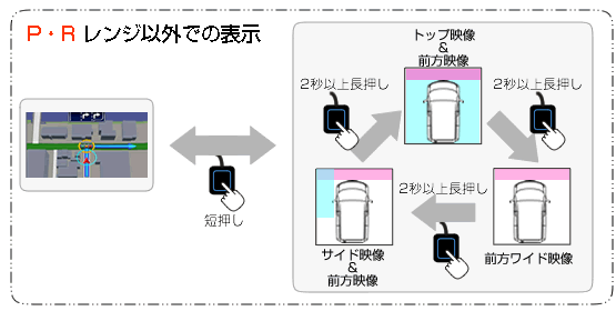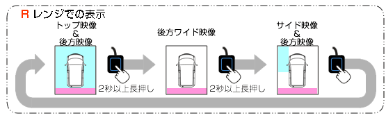 | ご注意 本製品は「全方位モニター設定」で「カメラ起動後の前進画面」および「カメラ起動後の後退画面」の設定を 「トップ映像+前方映像」「トップ画面+後方映像」でご使用ください。 他の設定では映像切り替えが正常に行われません。 設定の詳細は本品「取付・取扱説明書」をご確認ください。 |