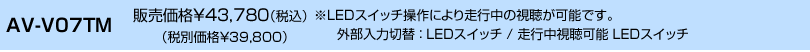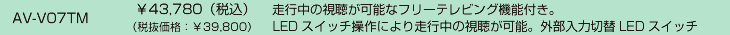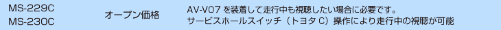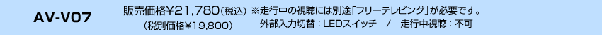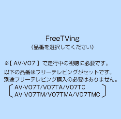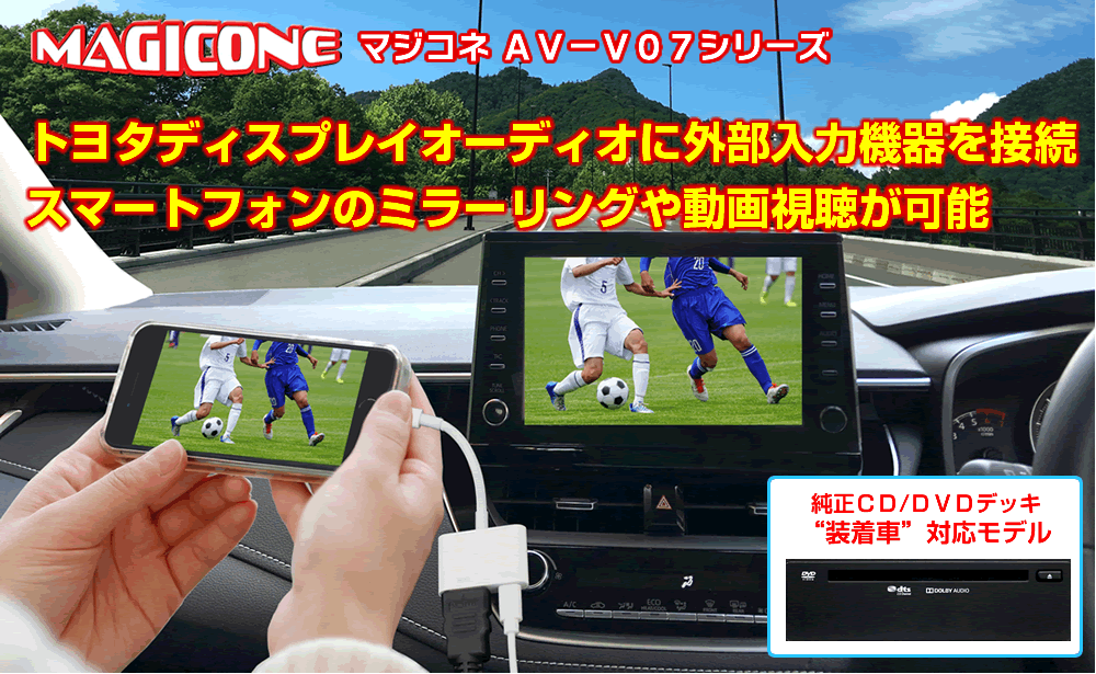 | 【共通】注意事項 ※ トヨタ ディスプレイオーディオ以外(適合表に記載されている車両以外)には取り付けることができません。 ※ トヨタ 販売店オプション【CD・DVDデッキ非装着車】には取り付けできません。(CD・DVD非装着車は【AV-V05シリーズ】をお買い求めください。) ※ 他社製品との併用は誤作動や故障の原因となりますので絶対におやめください。 ※ スマートフォンやアプリによっては視聴できない可能性があります。またアップデートや仕様変更等で視聴できなくなる可能性もあります。 ※ 製品仕様や適合情報を予告なく変更する可能性があります。 【AV-V07】注意事項 ※ 走行中に視聴したい場合【AV-V07T/AV-V07TM/AV-V07TMA/AV-V07TMC】を装着するか、車両に適合する別売のフリーテレビングを併用して取り付けてください。 【AV-V07T】【AV-V07TM】【AV-V07TMA】【AV-V07TMC】注意事項 ※ 走行中に接続した外部機器の視聴だけでなく、テレビ視聴やナビゲーションの操作も可能になります。 (販売店オプションでテレビとナビゲーションが設定されている場合に限ります。) ※ 【AV-V07T】のテレビング機能はオートタイプです。製品を装着すると走行中に接続した外部機器を視聴することができるようになります。 ※ 【AV-V07TM/AV-V07TMA/AV-V07TMC】のテレビング機能はスイッチ切替タイプです。エンジン始動後、スイッチを操作することで走行中に接続した機器を 視聴することができます。エンジン停止後はノーマル状態(視聴できない状態)に戻ります。 ※ 運転者は走行中にディスプレイオーディオ画面の注視やナビゲーションの操作は絶対に行わないでください。 |