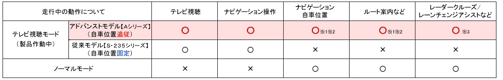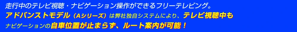 | ※1 本製品作動中のナビゲーションの自車位置は、弊社独自のシステムにより精度を高めた動作をさせていますが、ノーマル状態とは動作が異なります。 より正確な自車位置情報を必要とする場合はノーマル状態(テレビ視聴不可)でナビゲーションを使用してください。 ※2 一部車種については車両ナビゲーションの仕様により、本製品作動中に一定条件で走行すると「GPSのみ」で測位する場合があります。 その際、GPSが受信できない状況(トンネル内など)では自車位置が停止する場合があります。 ※3 一部車種でテレビモード中に一定の条件を満たすと、レーダークルーズコントロールやLCA(レーンチェンジアシスト)が使用できなくなる場合がありますが、 アドバンスモデルの対応品番ではこれらの機能も使用可能です。 |