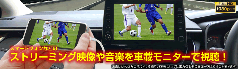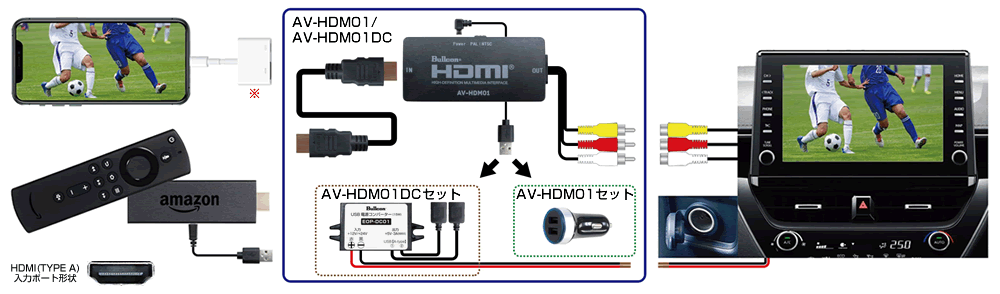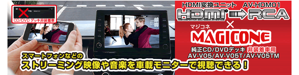| ご購入前に必ずお読み下さい。 ・本製品はHDMIデジタル信号をRCAアナログ信号へ変換する製品です。スマートフォン・ストリーミング機器等のHDMI出力機能に関しては、各機器の取扱説明書をご確認ください。 ・本製品に接続機器およびモニター類は付属しておりません。お客様でご用意ください。 ・RCA入力設定の無いナビゲーションやディスプレイモニターへは接続できません。 ・仕様及び外観は改良の為、予告なく変更する場合があります。 接続機器について アプリについて 安全及び取付、使用に関するご注意 保証規定 ウェブサイト掲載品の著作権・商標権について | |||||||||||||||||||||||||||||