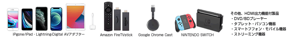 | ※上記機種は2020年8月1日時点で弊社の自社検証に基づく動作確認機種の一例です。 機種によってはOSやソフトのバージョンおよびアップデートにより映像出力できない場合があります。 最新のOSにバージョンアップできない機種(サポート対象外機種)については動作保証対象外となります。 動画ストリーミングの視聴にはインターネットへの接続が必要です。また、通信費用はお客様のご負担となります。 HDMI出力機能の無い製品ではご使用いただけません。 |