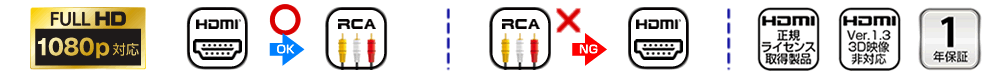 HDMI RCA(黄:映像・ 白:音声(L) ・ 赤:音声(R) (H)39mm ×(W)84mm ×(D)16mm 64g(RCAケーブル含む) DC+5V/マイナスアース(USB) MAX1A(消費電力:Max5W) 0℃~+70℃ +10%~+85% 1.3(3D映像非対応) 480i/480p/576i/576p/720p 1080i/1080p/HDCP対応 HDMI変換ユニット本体(RCAケーブル:95cm) HDMI2.0対応ケーブル:(両端(Type A)オス端子/2m) USB電源ケーブル(1.2m) 2ポートUSB出力シガープラグ(12V・24V対応) 取付・取扱説明書兼保証書 |