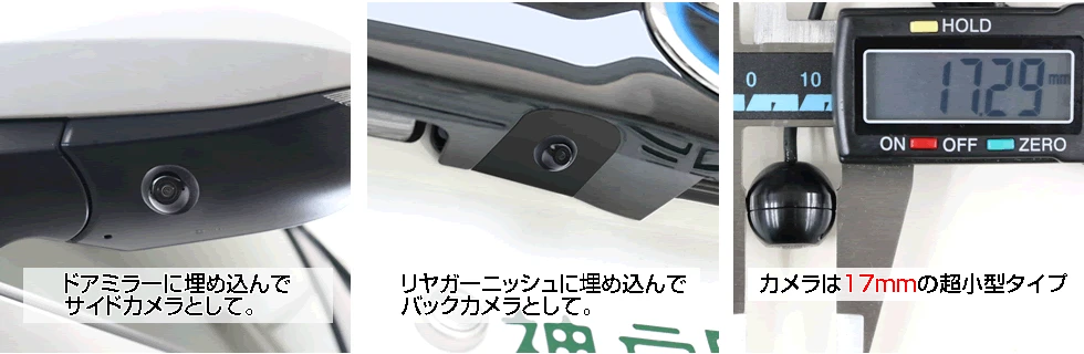 | 高解像度 埋め込み小型カメラには、「進路表示」「縦列ガイド」「距離目安ガイド」などの機能はありませんのでご注意ください。 | |||||||||||||||||||||||||||||