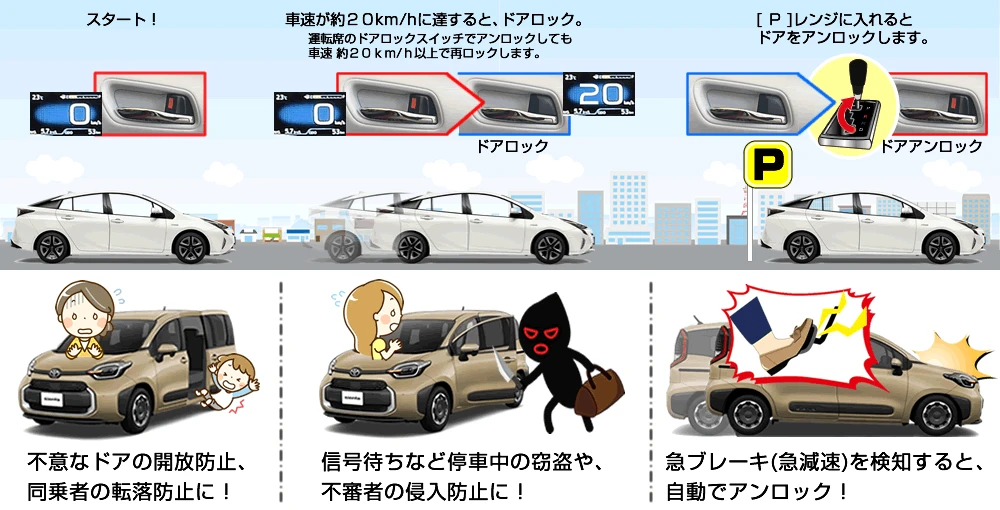 ◎専用コネクターに取り付けるだけで車速ドアロック機能が追加されます。 ◎シフトを「D」レンジに入れ、走りだすと車速約20km/hでロックし、停車後は「P」レンジでアンロックします。 ◎運転席集中ドアロックスイッチまたはロックレバー操作によるアンロック後でも車速約20km/hで再ロックします。 ◎急ブレーキ(急減速)を検知した場合、自動でアンロックします。 |
