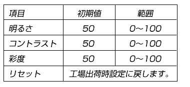 | 画面の明るさ・彩度・コントラスト、3つの画質調整機能を搭載。お好みに合わせた画質調整が可能です。 |