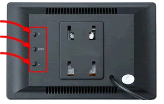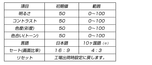 本体背面のボタンを押すことで、画面の明るさ・コントラスト・彩度・トーン(色調)の4種類の画質調整と、画面比率 [ 16:9 ] [ 4:3 ] の変更が可能。 |