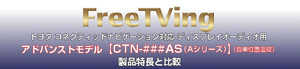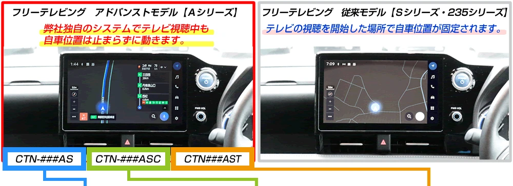 従来のトヨタ コネクティッドナビ対応フリーテレビングは、テレビ視聴中のナビゲーションの自車位置が不正確になるため、ルート案内や位置情報を使用する機能に制限がありました。 フリーテレビング アドバンストモデル対応の「Aシリーズ」は、弊社独自のシステムを採用することで、ナビゲーションの自車位置が高精度で動き、ルート案内やナビの自車位置情報に基づく機能が使用できます。 また、ナビゲーションの音声案内も高い精度で再現されるので、テレビモードでも安心して運転することができます。 |